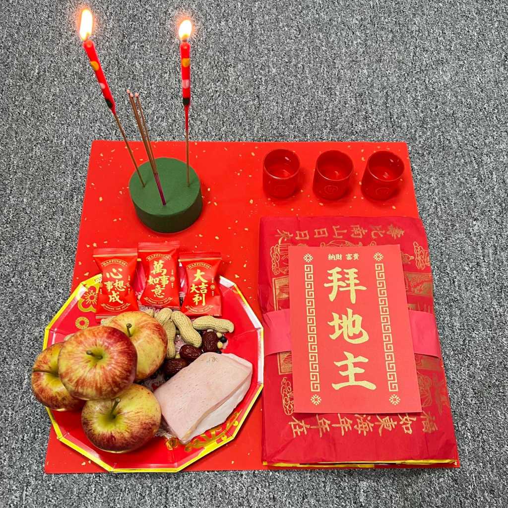 包括:5件肥美生豬肉連皮、4個蘋果、4個雪梨、連殼花生、紅棗、白米、五色種子、祝福語糖果、75ml 燒酒、430ml 蒸餾水、香、蠟燭、所有器皿、化寶盤、火鉗。