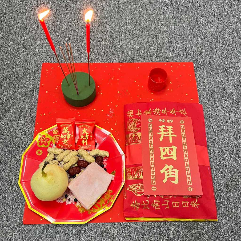 「拜四角」乃香港本地傳統習俗,一般於裝修(動土)前或入住前進行「拜四角」儀式,主要目的:1.向地方神明/家神/地主,禮貌地打招呼,稟明入住者即將入住或動土裝修。2.驅逐靈體邪氣及負能量。3.撇清與上手住客之關係,避免承接上手住客之晦氣。